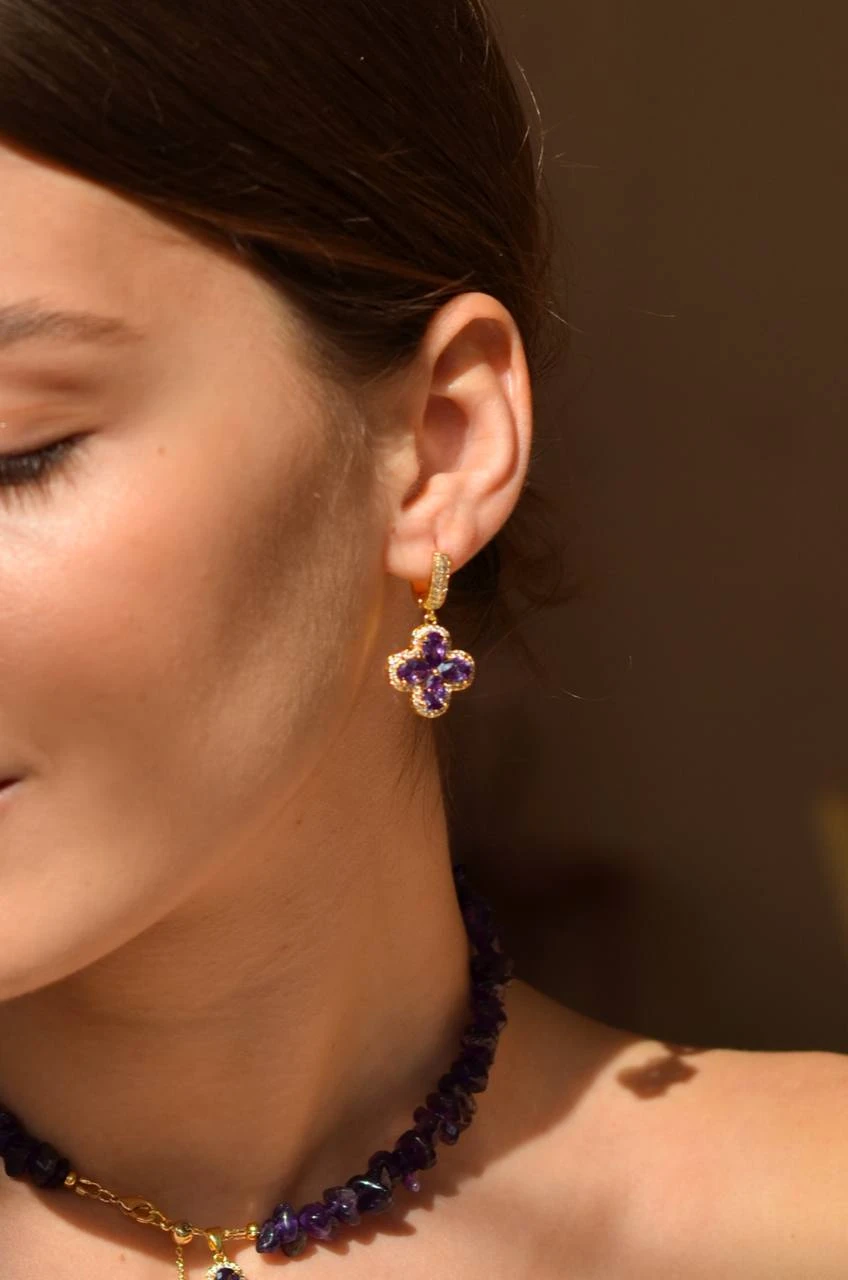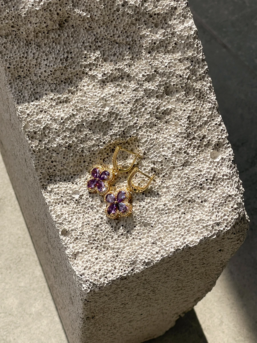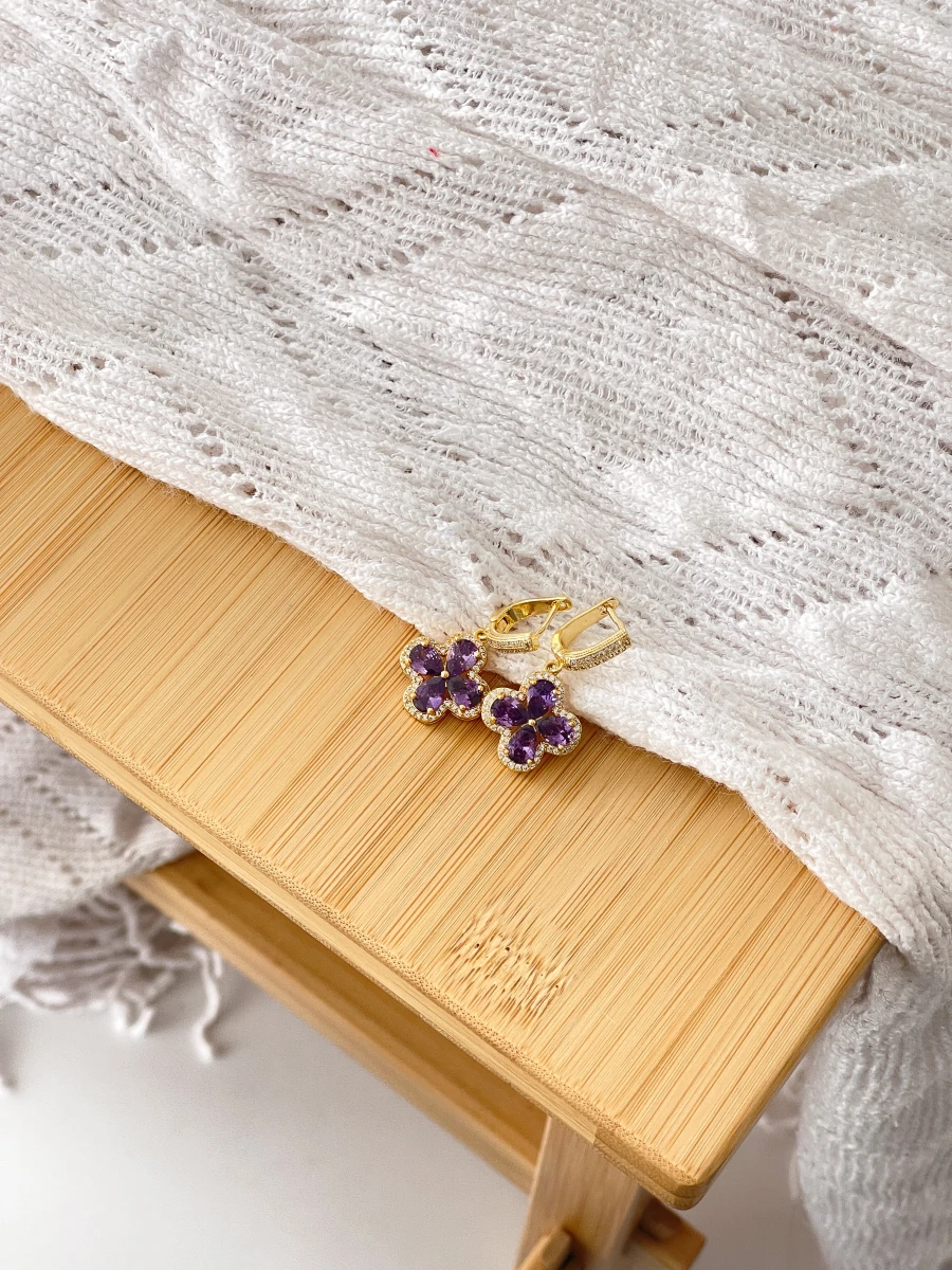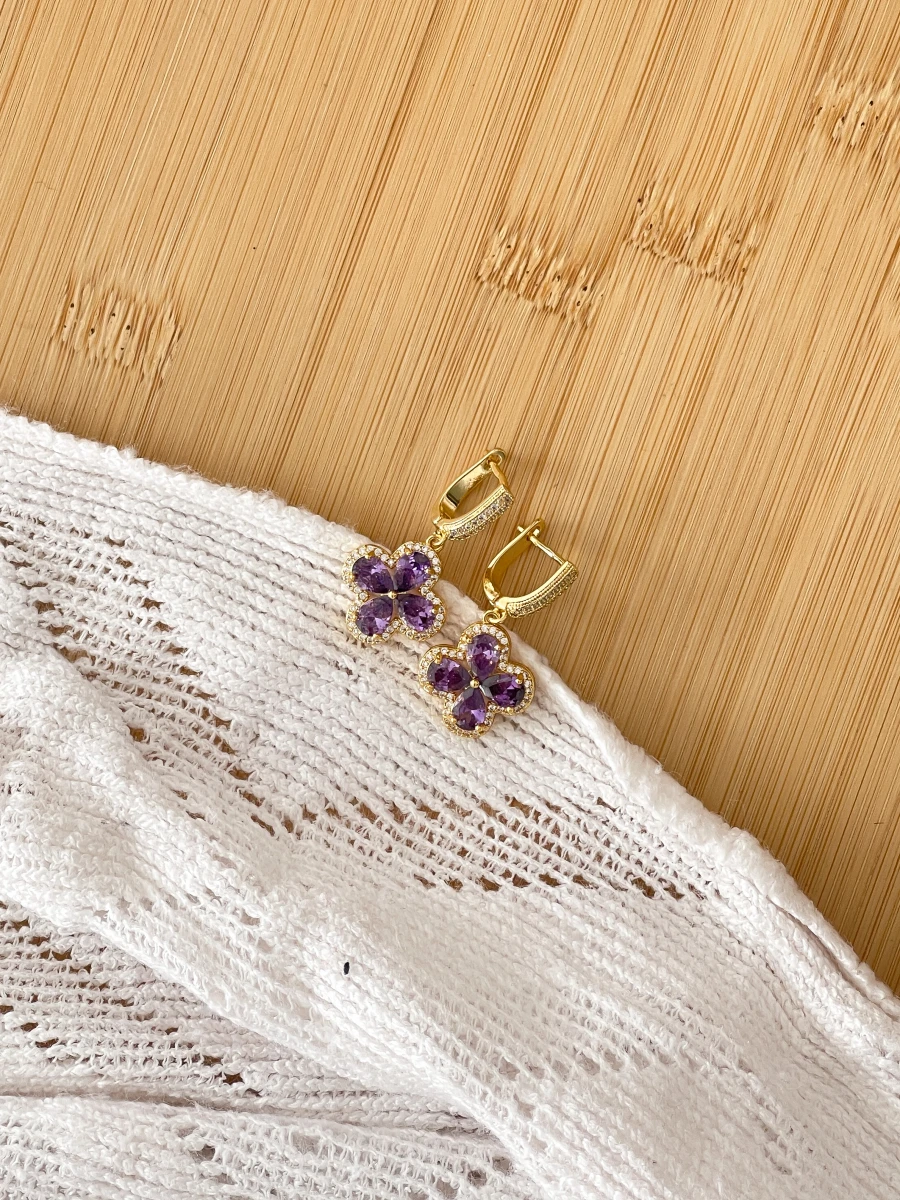 Сережки "Purple Clover" — елегантний аксесуар, створений для стильних і впевнених у собі жінок. Виготовлені з медсплаву з позолотою, вони чудово поєднують сучасний дизайн та вишуканість. Вставки з фіанітів додають блиску, підкреслюючи красу та елегантність кожної жінки. Ідеальний вибір для будь-якої події.
