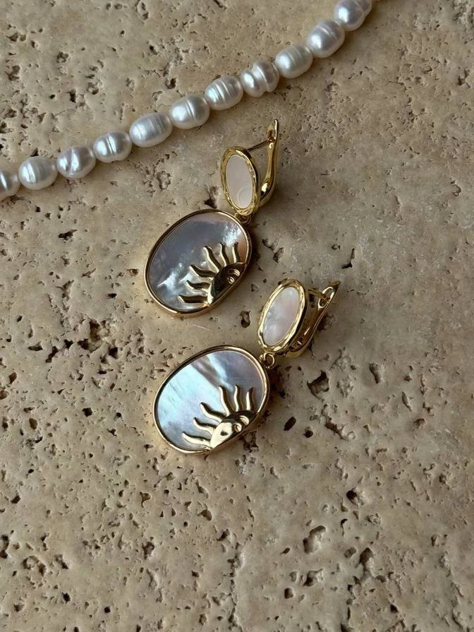 Сережки "Сонце" - це стильні та елегантні прикраси, які ідеально підійде для будь-якого випадку. Вони виготовлені з міцного та довговічного медсплаву, покритого позолотою, з перламутровою вставкою. Сережки мають зручну англійську застібку, яка дозволяє легко одягати та знімати їх.
