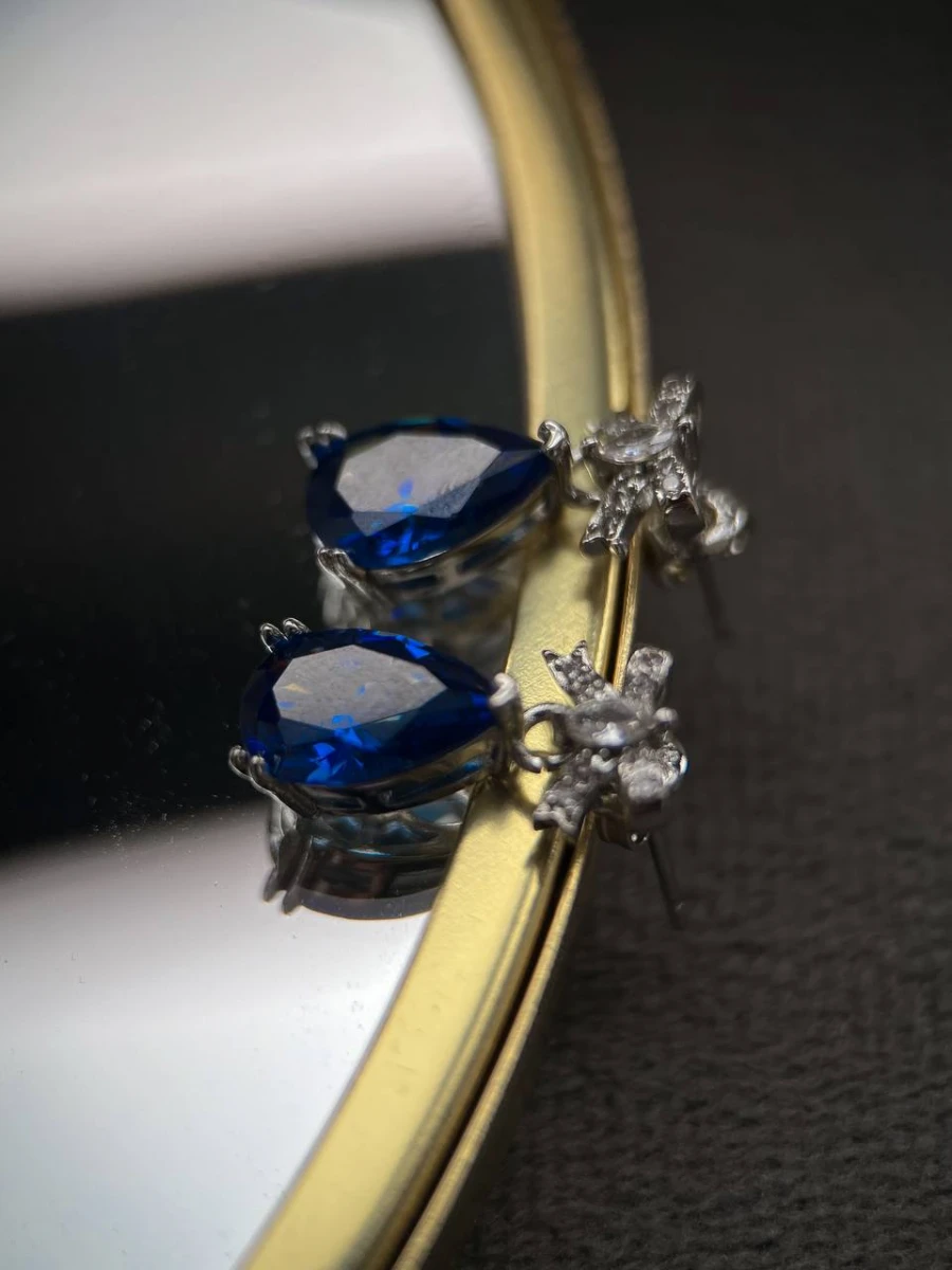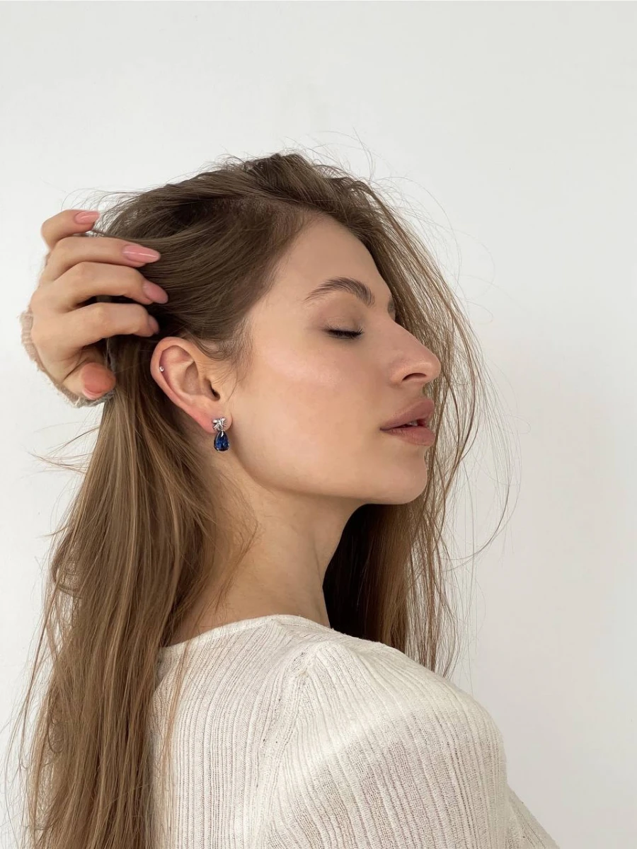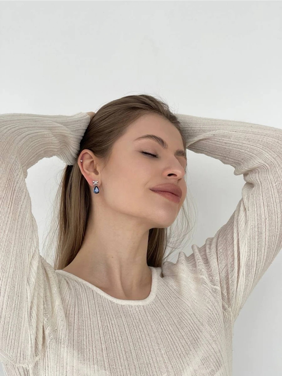 Елегантні сережки "Steel Blue" виготовлені з якісного медичного сплаву, покриті сріблом для довговічності та розкішного вигляду. Вставка з фіанітів надає їм ніжного блиску, додаючи витонченості кожному образу. Зручна застібка-пусет забезпечує комфортне носіння протягом усього дня.