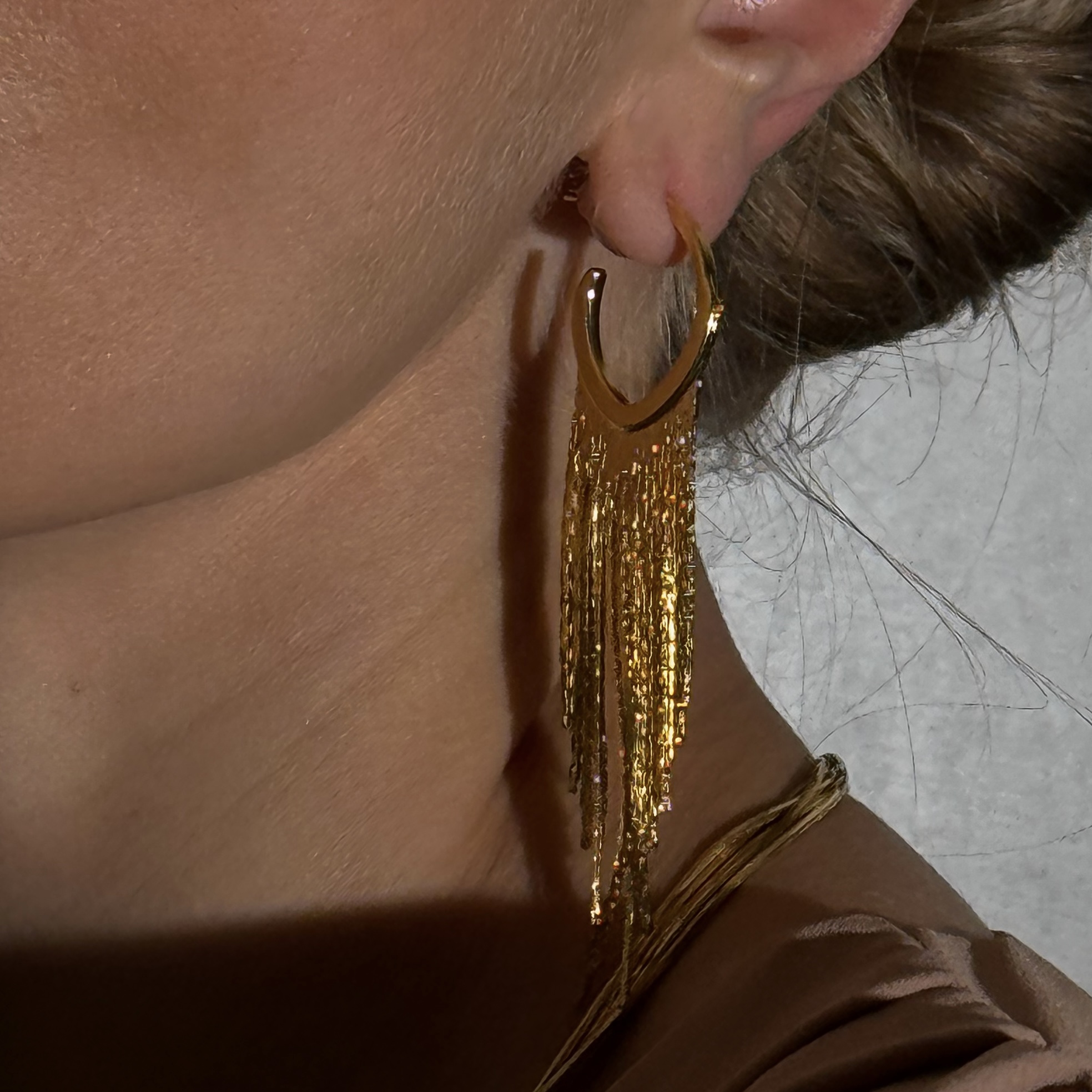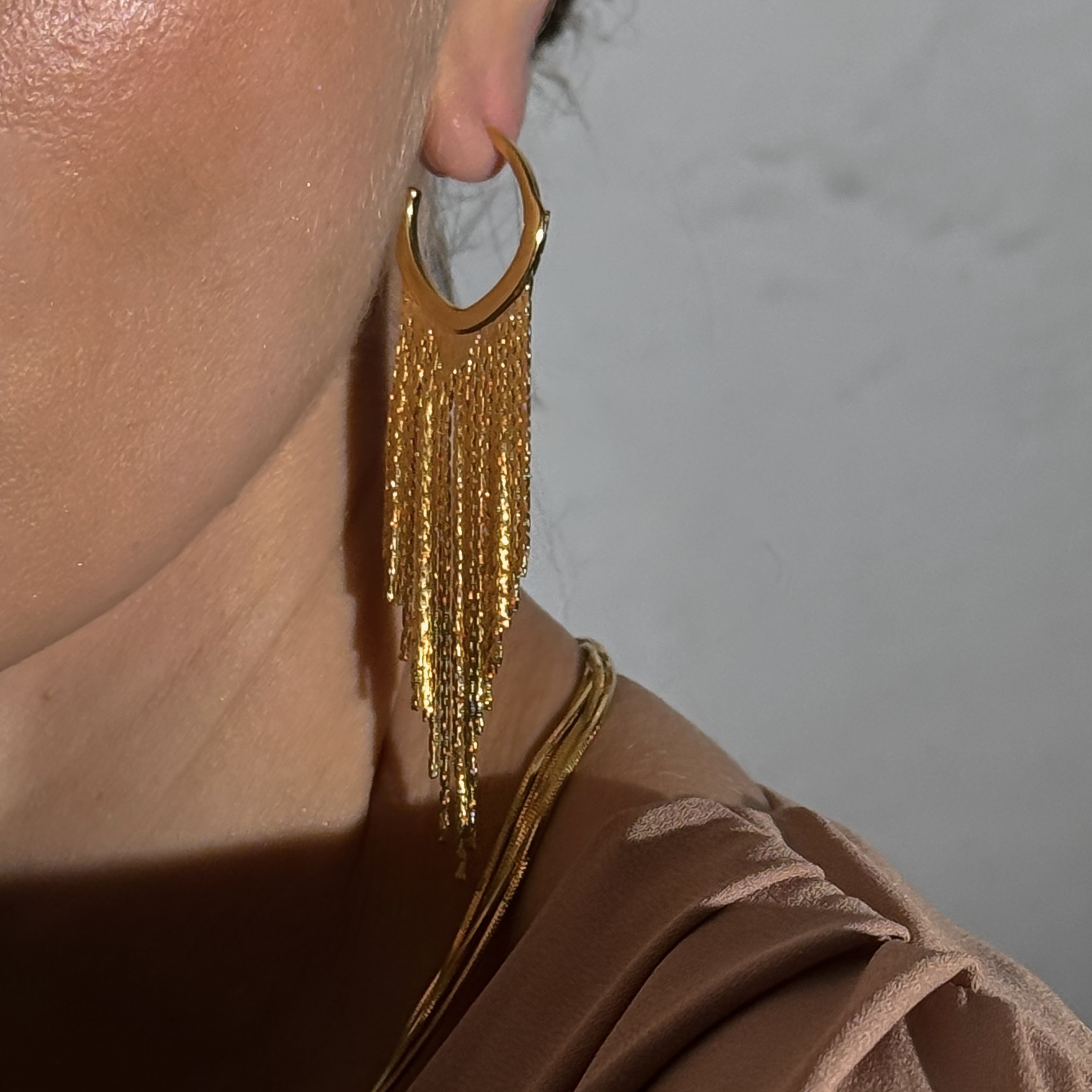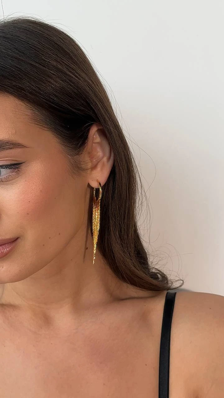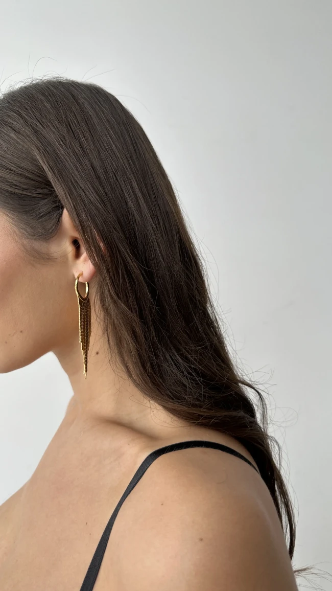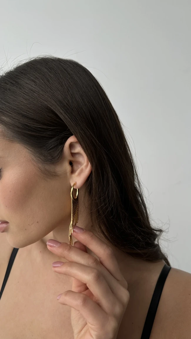 Сережки "Tail" - це неймовірно ефектний аксесуар, який додає вашому образу особливий шарм та розкіш. Вони виготовлені з позолоти і мають довгі ниточки, які створюють зачаровуючий ефект при русі.