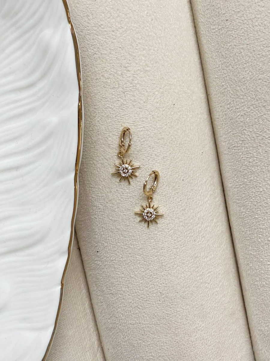 Сережки "Зіркові" — витончені прикраси, що додають блиску кожному образу. Виготовлені з медсплаву з покриттям позолоти та інкрустовані сяючими фіанітами. Зручна застібка-кільце забезпечує комфортне носіння. Ідеальні для вечора чи особливої події.