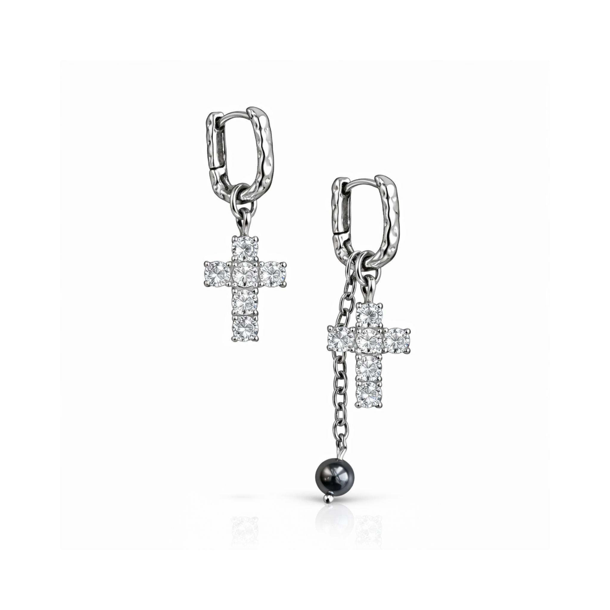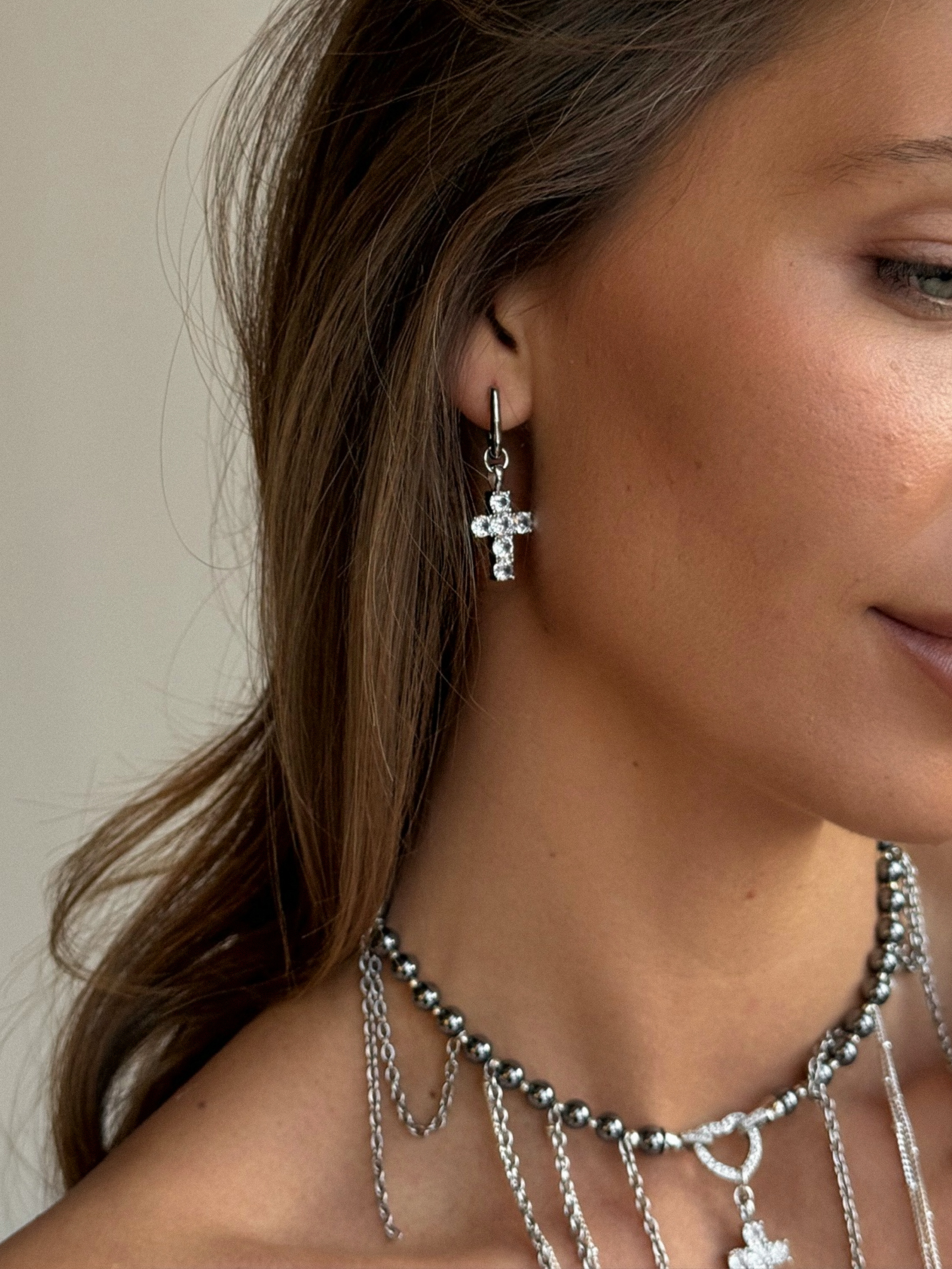Сережки «Cosmo Church» — стильні та виразні прикраси з терагерцу та сяйливих цирконів. Срібне покриття на медсплаві підкреслює холодну космічну естетику, а застібка-кільце забезпечує надійне та зручне носіння.