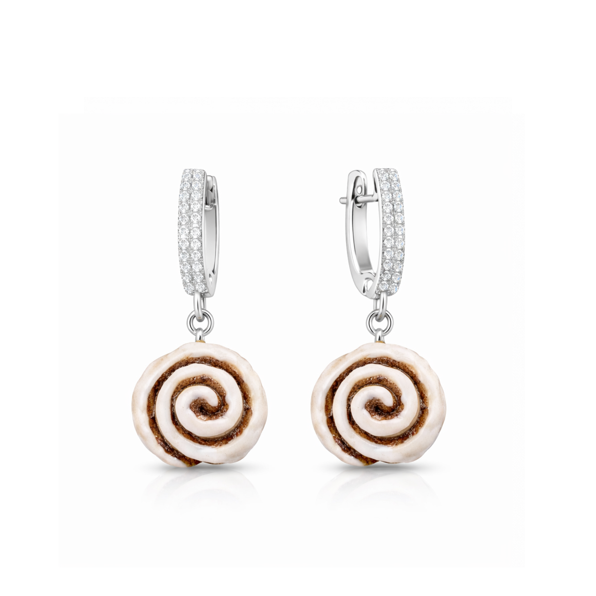 Сережки “Сінабон” — стильна прикраса з ніжним шармом. Вони створені з медсплаву зі срібним покриттям і доповнені кулоном із полімерної глини у формі мініатюрного сінабона. Вставки з фіанітів додають сережкам делікатного блиску, що красиво підкреслює обличчя.