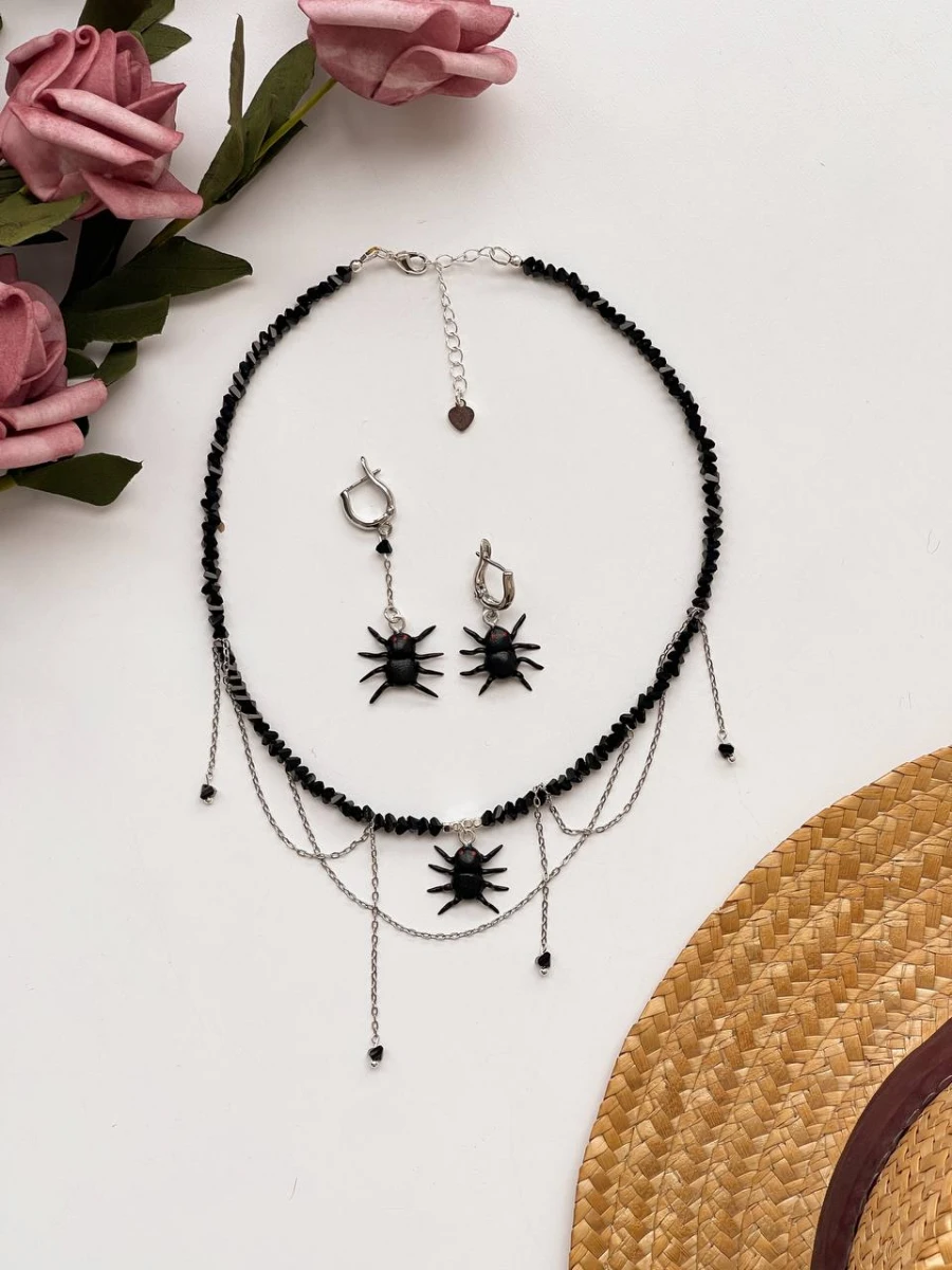 Сет “Black Spider” — це яскравий тандем готичного шарму та сучасного стилю. Лаконічний чокер із чорного ювелірного скла й гематиту з кулоном-павуком доповнюється оригінальними сережками з полімерної глини зі срібним покриттям. Разом вони створюють сміливий, виразний образ, який підкреслює індивідуальність і додає впевненості. Ідеальний вибір для вечірніх виходів, тематичних подій або як стильний акцент у повсякденному луці.