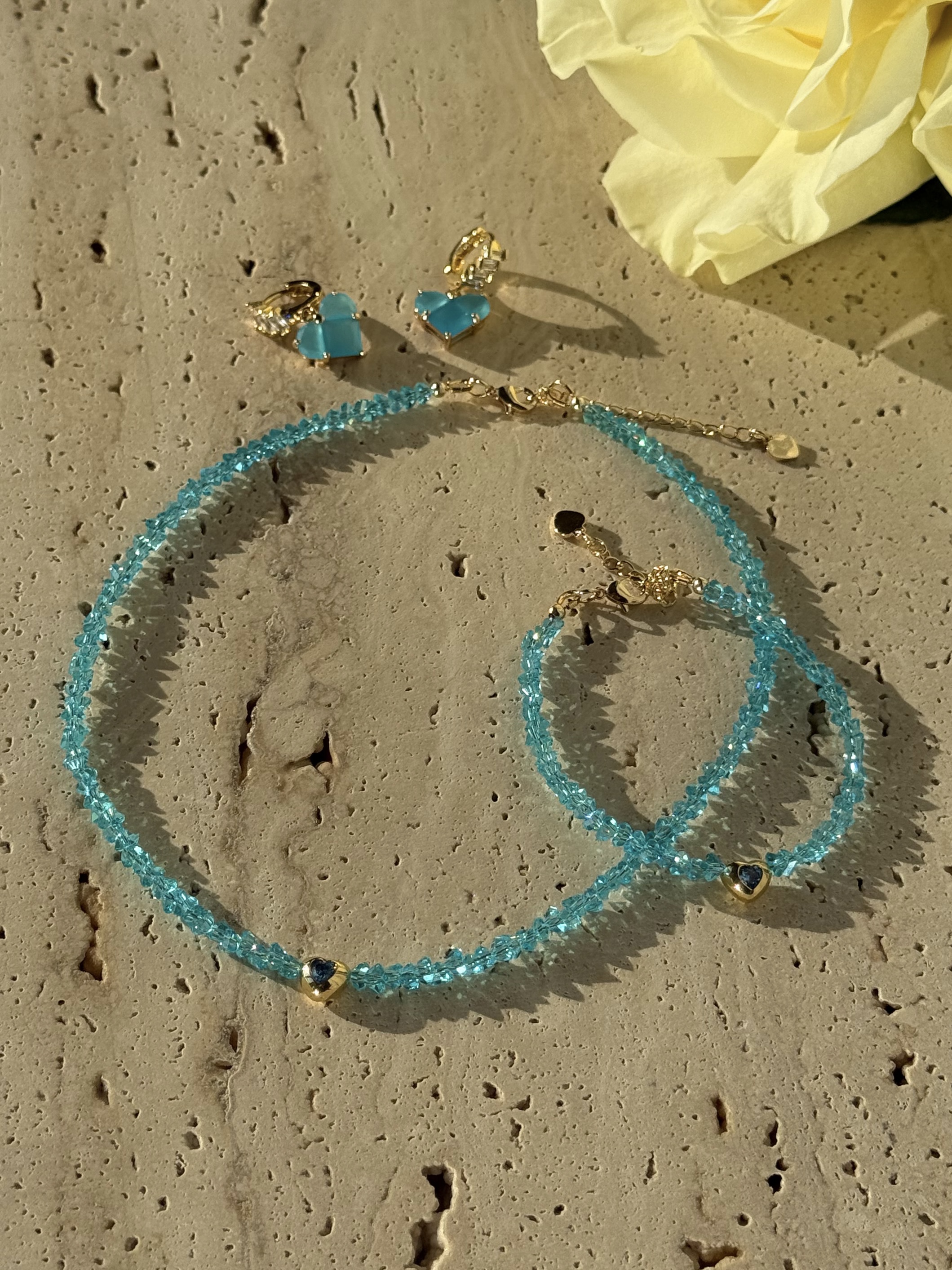 Кольє та браслет «Blue Chic» оснащені застібкою-карабіном із подовжувачем 5 см, що забезпечує комфортну посадку та універсальність у носінні. Сережки у блакитному відтінку з серцями та застібкою-кільцем ніжно доповнюють комплект, роблячи його ідеальним для романтичних вечорів і стильних повсякденних образів.