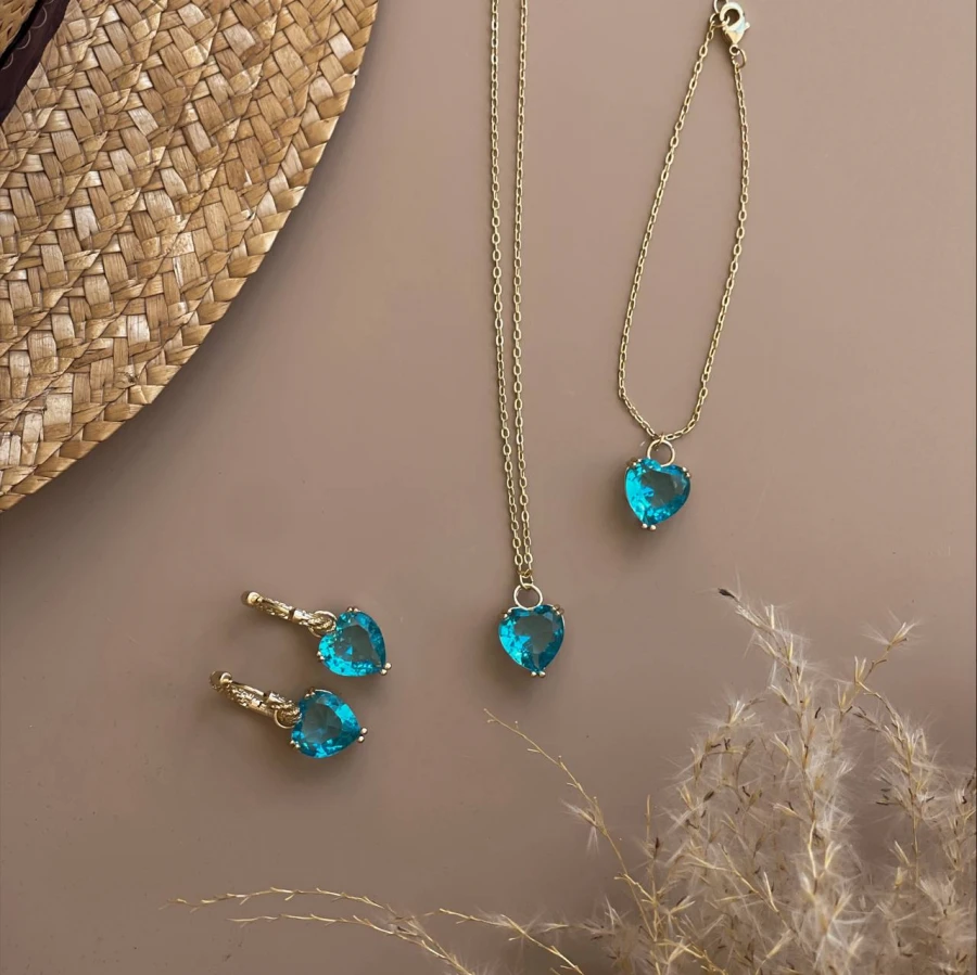 Браслет із блакитним серцем завершує ансамбль, додаючи йому гармонії та завершеності. Символіка серця у кожному елементі сету втілює любов, тепло та витонченість, роблячи його універсальним вибором як для повсякденних образів, так і для особливих подій.