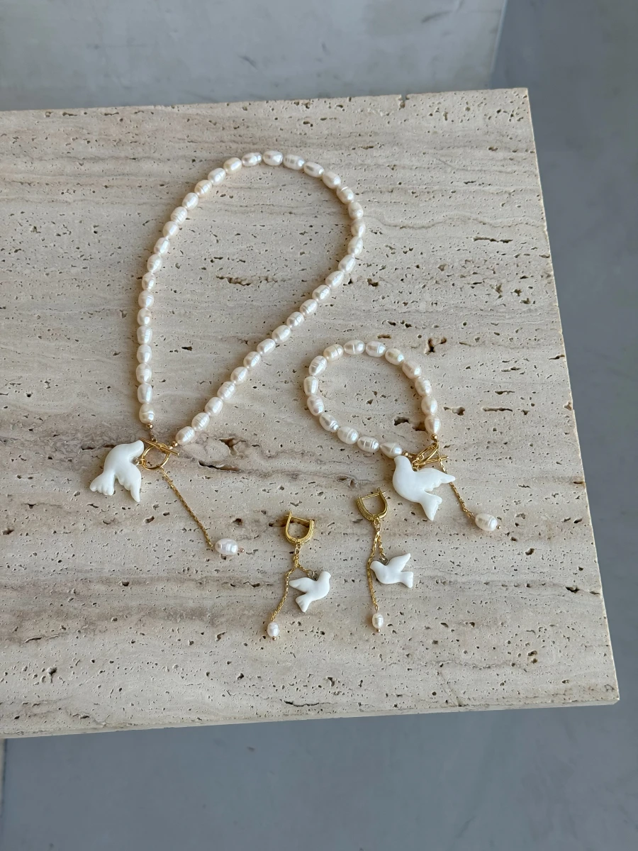 Сет прикрас «Gold Горлиця» – елегантний комплект із сережок, кольє та браслета. Виготовлений з перлин, медсплаву з позолотою, полімерної глини та фіанітів, він поєднує в собі витонченість, український колорит і сучасний стиль. Фігурка горлиці на кольє додає символізму, сережки підкреслюють красу та індивідуальність, а браслет завершить гармонійний образ. Ідеальний вибір для особливих подій та щоденного носіння.