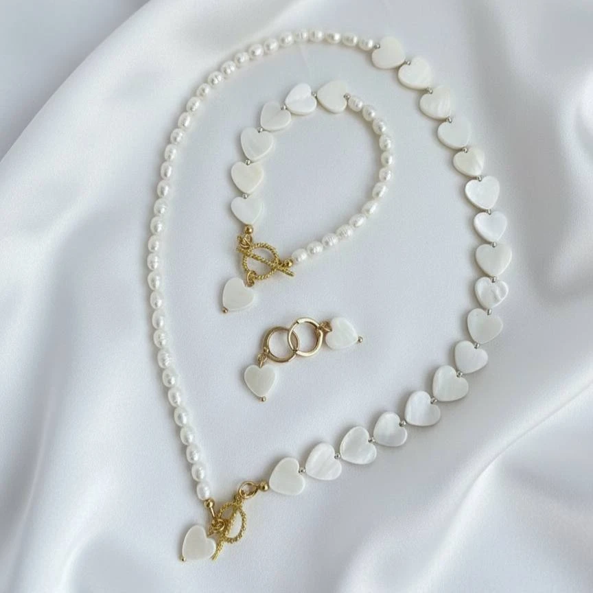 Вишуканий набір Gold Vita складається з сережок, браслета та кольє, створених для тих, хто цінує елегантність і сучасний стиль. Позолочені елементи, перламутрові серця та перли утворюють гармонійний ансамбль, що легко поєднується як з повсякденними образами, так і зі святковим вбранням.