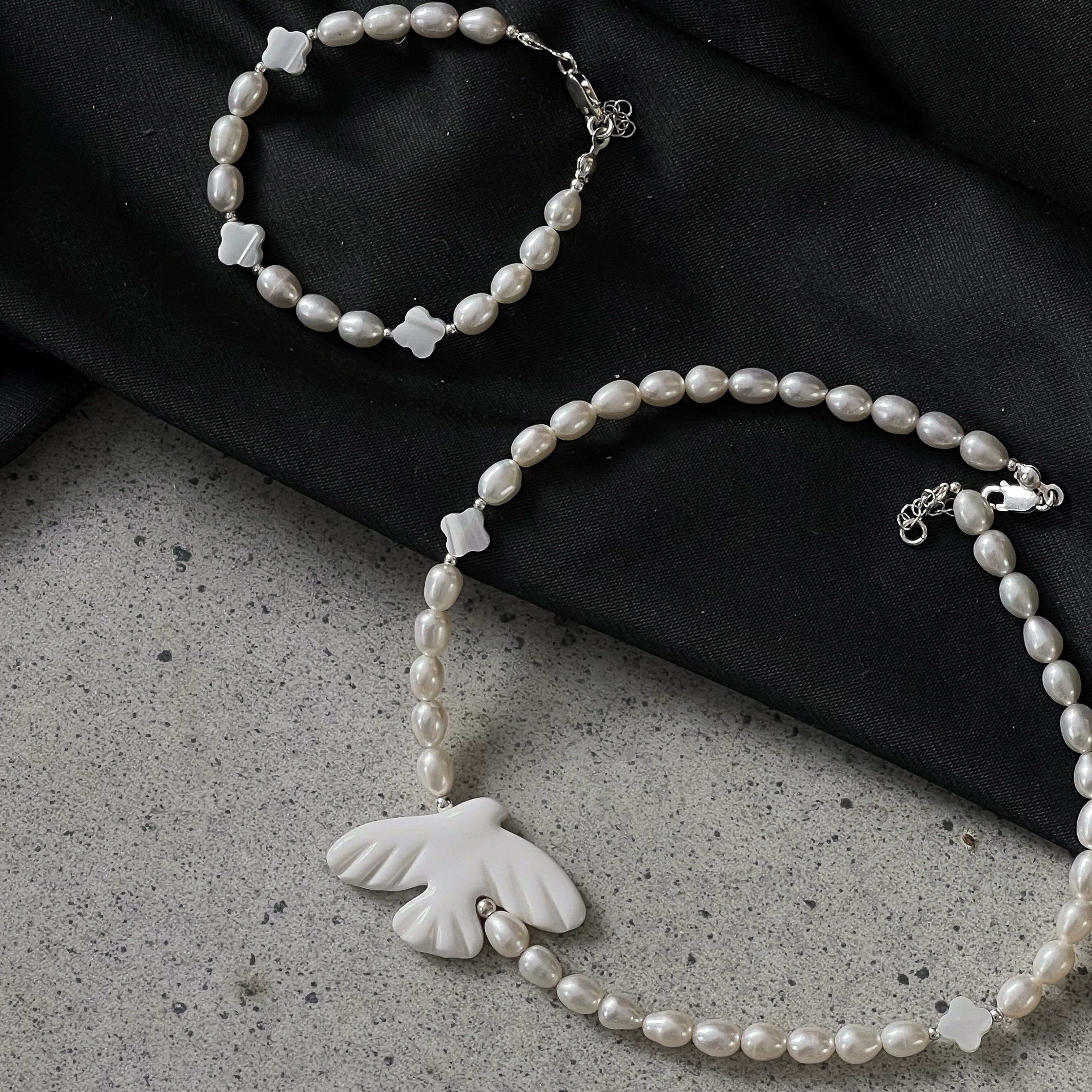 Сет Luxury Пташка — вишуканий комплект із кольє та браслета, створений для тих, хто цінує унікальні деталі та сучасну естетику. Основою прикрас є преміум перли, які мають рівний блиск і виглядають по-справжньому розкішно. Акуратні елементи з полімерної глини, включно з декоративною пташкою, додають сету індивідуальності та ручної теплоти. Обидві прикраси оснащені зручними карабінами та подовжувачами по 5 см, що дозволяє комфортно регулювати довжину. Фурнітура зі срібним покриттям підкреслює чистоту та стиль виробів. Сет Luxury Пташка виглядає ніжно, сучасно та стане ідеальним акцентом у повсякденних і святкових образах.