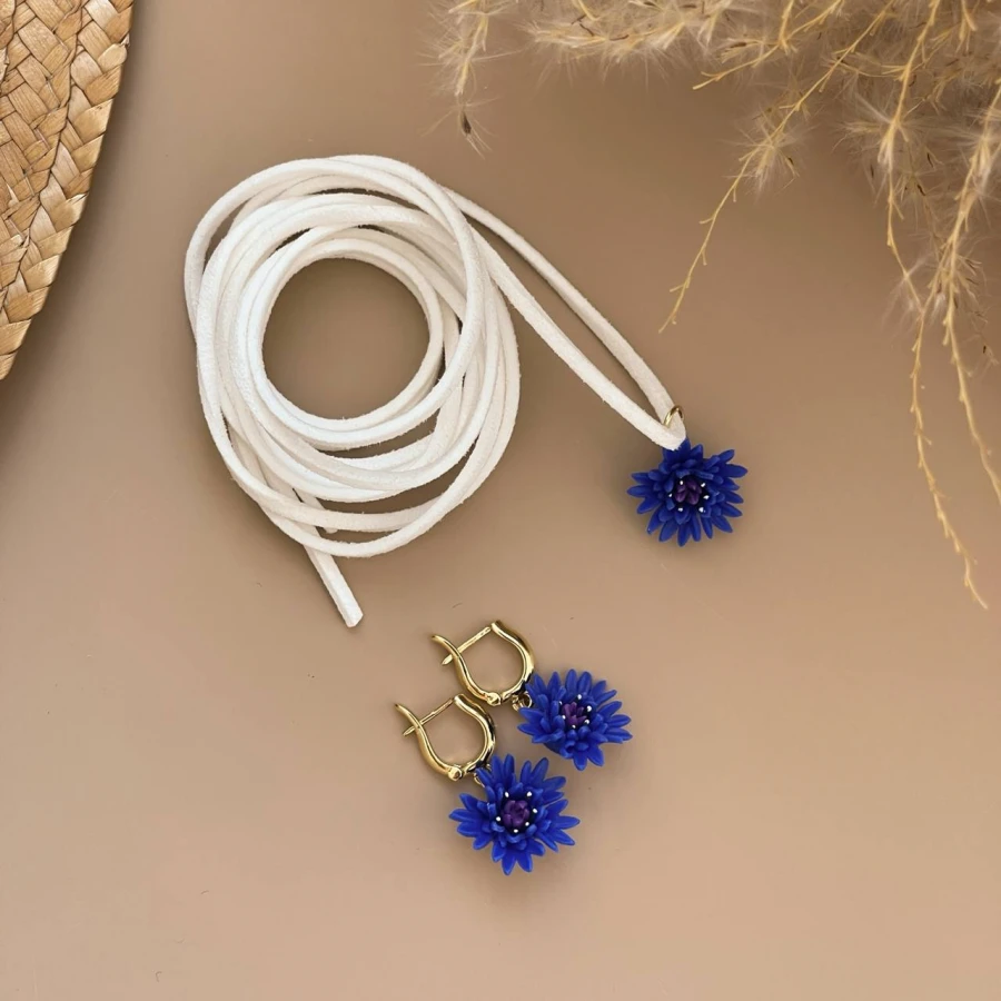 Чокер на білій мотузці з декором із полімерної глини додає образу легкості та природної чарівності. Сережки з ніжною волошкою підкреслюють жіночність та вишуканість, створюючи гармонійний дует.