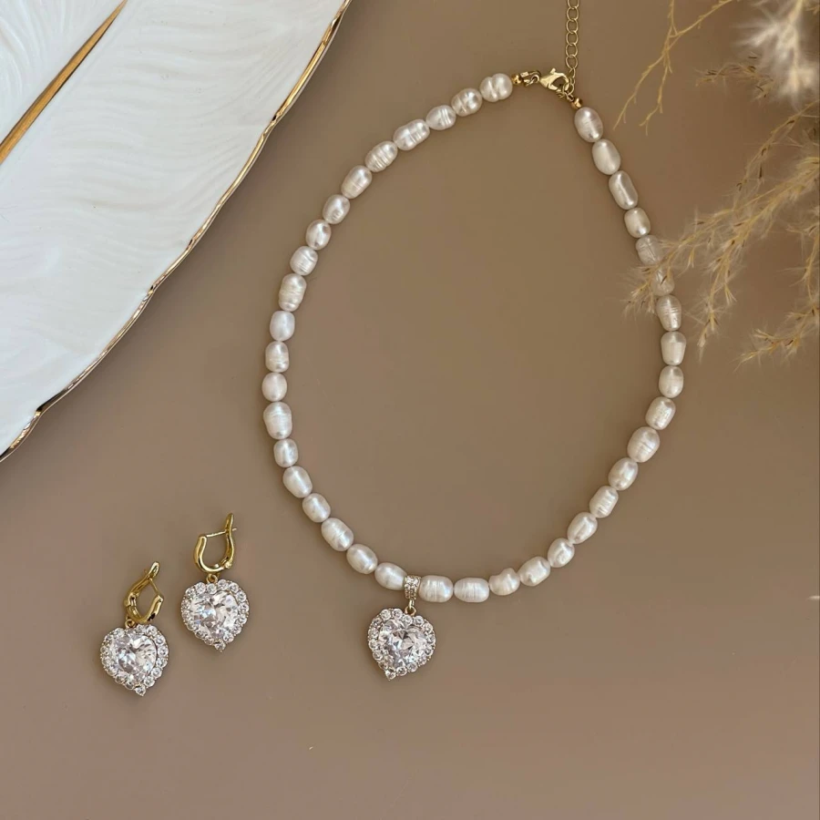 Кольє з натуральними річковими перлами та кулоном-сердечком, інкрустованим сяйливим фіанітом, уособлює гармонійне поєднання класики й сучасності. Позолота на медсплаві надає прикрасі теплий благородний відтінок і підкреслює її витонченість. Воно стане стильним акцентом як у повсякденному, так і у святковому образі, додаючи йому завершеності та чарівності.