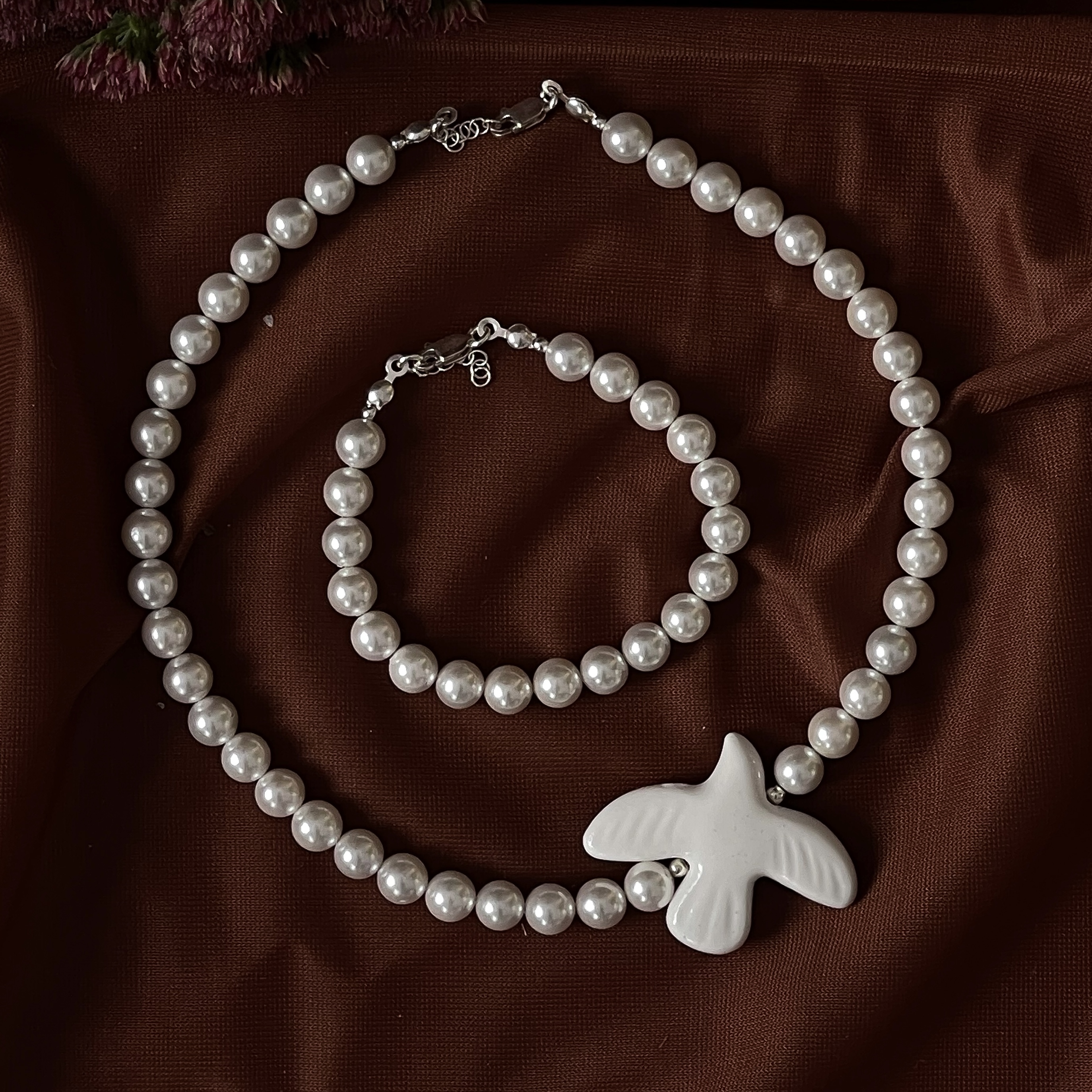 Сет White Горлиця — ніжний комплект із кольє та браслета на перлинах Майорка, створений у світлому, легкому стилі. Кольє доповнене керамічною пташкою та має подовжувач 5 см, фурнітура зі срібним покриттям надає йому чистого благородного блиску. Браслет виконаний у такому ж дизайні, також зі срібним покриттям і подовжувачем 5 см, що дозволяє зручно регулювати розмір. Сет виглядає ніжно, символічно та універсально підходить до будь-якого повсякденного чи романтичного образу.